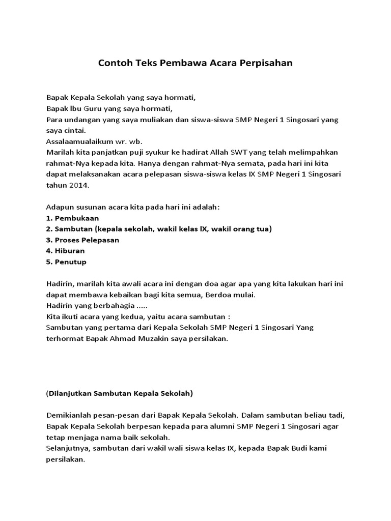 Contoh Teks MC Singkat Acara Perpisahan Sekolah Teks MC Singkat Acara Perpisahan Sekolah Yang Kami Hormati Bapak Sudirman spd sebagai kepala sekolah Smp 5 Karang tunggal. Dan semua dewan guru dan staf Smp 5 Karang Tunggal. Contoh Teks Pembawa Acara atau MC Perpisahan Pesantren atau Haflah.